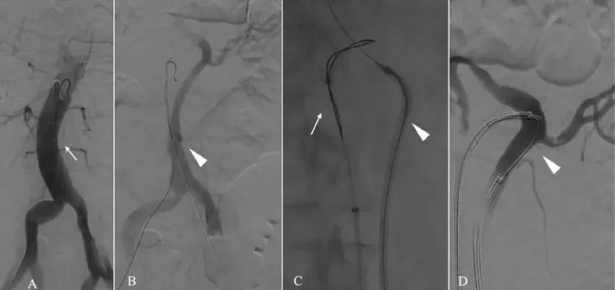 血管造影显示通电导丝从假腔到真腔。(A)DSA显示真腔(TL)(B)DSA显示假腔(FL),左肾动脉由FL供血(C)从假腔(白色三角)穿过真腔(白色箭头)(D)DSA显示通过路径,允许稳定进入FL(白色三角)