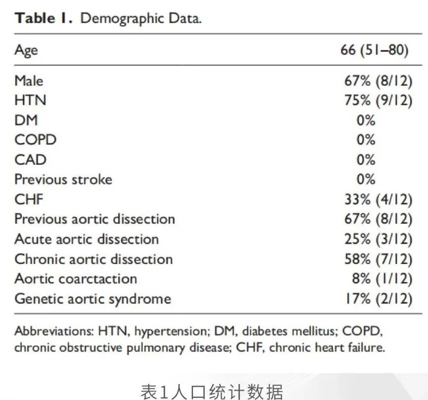 治疗了11例主动脉夹层和1例主动脉闭锁。其中4例为急诊手术,其余均为计划内手术。7例患者接受了夹层内膜片穿孔术,2例患者接受了导丝夹心技术其中2例患者接受了LSA原位开窗,1例患者接受了主动脉峡部闭锁腔内血管重建术。所有病例都成功应用了该技术。没有出现与该技术相关的并发症。