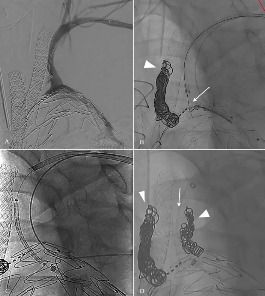 血管造影显示TEVAR分支开窗情况,计划分支至无名动脉(IA)和左侧颈总动脉(CCA)(A)。DSA显示左锁骨下动脉开口和主动脉支架之间几乎成90°(B)。带电导丝穿过支架,卡环将其捕获(白色箭头)。白色三角所示为左侧CCA假腔中的弹簧圈(C)。扩张假腔后,推进鞘管,放置球扩覆膜支架。然后拔出鞘管,支架即可展开(D)。LSA分支已经展开(白色箭头)。白色三角所示弹簧圈位于IA和LCCA的假腔。
