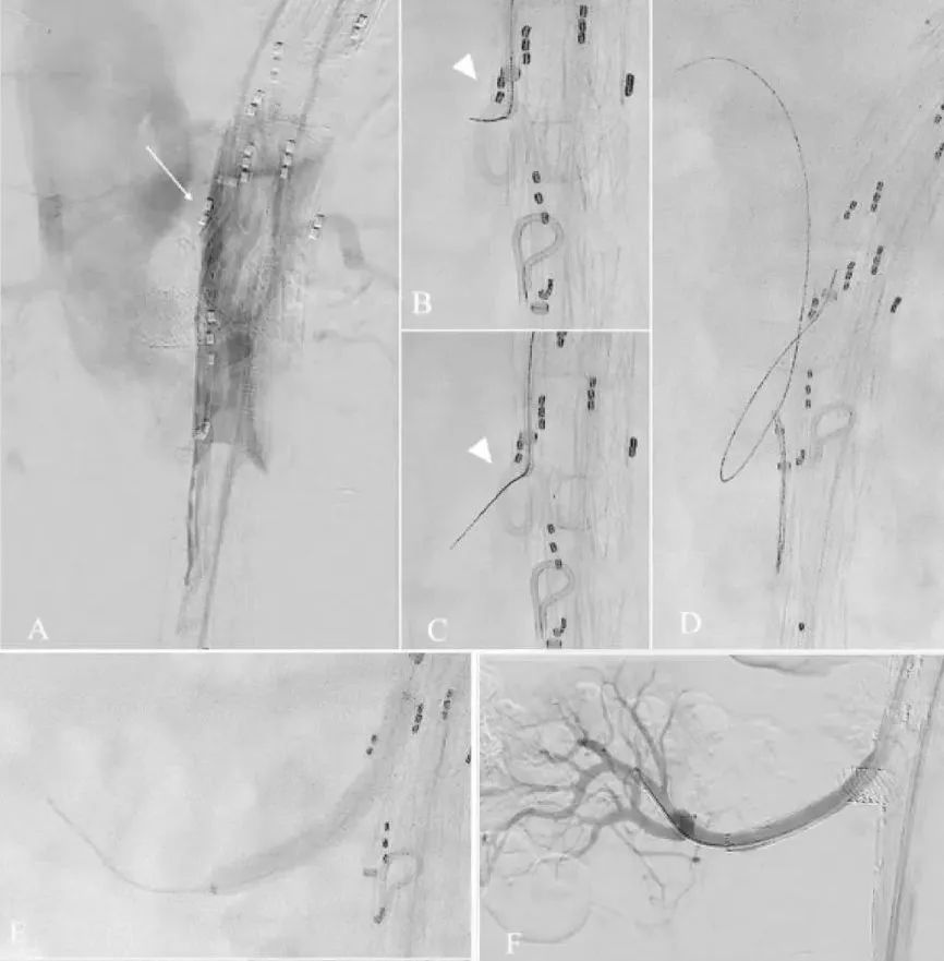 血管造影显示带电导丝对内膜片开孔(A)。DSA显示在真腔放置了一个分支支架。白色箭头显示导管处于分离真腔和假腔的内膜片上(B)(C)。透视图显示,以猪尾巴导管为目标,带电导丝(白色三角)穿过内膜片(D)。导丝被捕获(E)。右肾动脉桥接球扩覆膜支架(F)。DSA显示桥接支架成功穿过内膜片进入RRA。