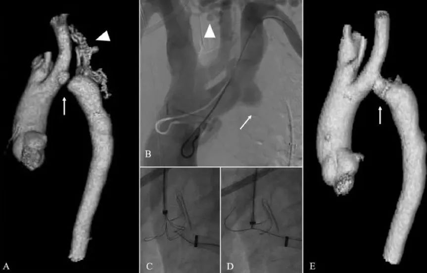(A)主动脉闭锁患者的CTA3D重建(A-E)和血管造影,可见主动脉闭锁(白色箭头),有一个延伸的侧支供应远端主动脉(白色三角)(B)DSA显示主动脉闭塞(白色箭头)和侧支网络(白色三角)(C)(D)带电导丝穿过主动脉闭塞处并被捕获(E)覆膜支架重建闭塞处后的主动脉CTA3D重建。
