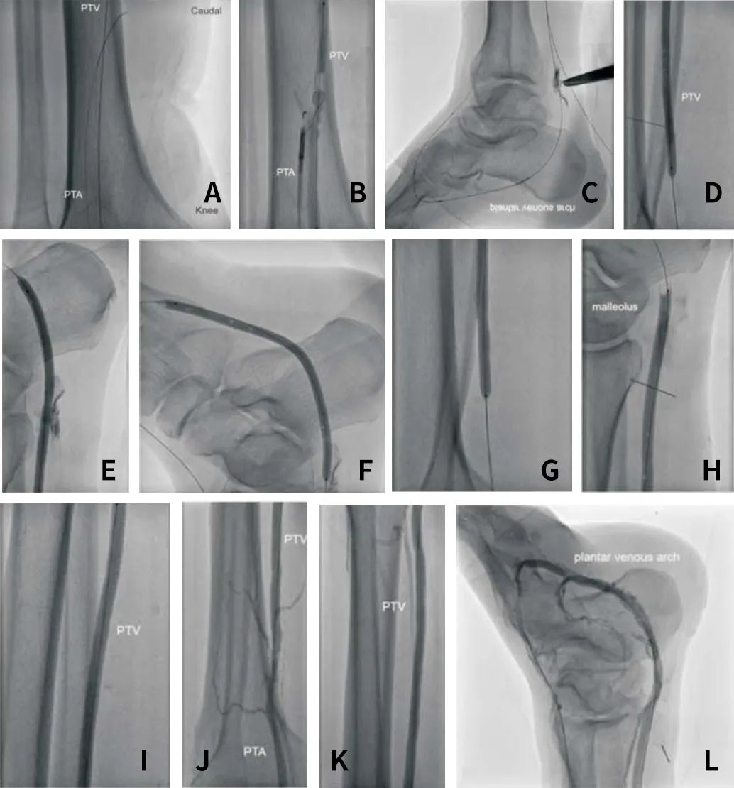 3、建立通路:使用V18导丝及Outback Reentry装置,经左胫后动脉(LPTA)穿刺LPTA-LPTV(图2B),导丝延伸至足底静脉弓和左胫前静脉,造影确认(图2C)。以10atm压力使用4.0*80mm Pacific球囊预扩张左胫后静脉(LPTV) (图2D、2E)和左足底深静脉(图2F)。