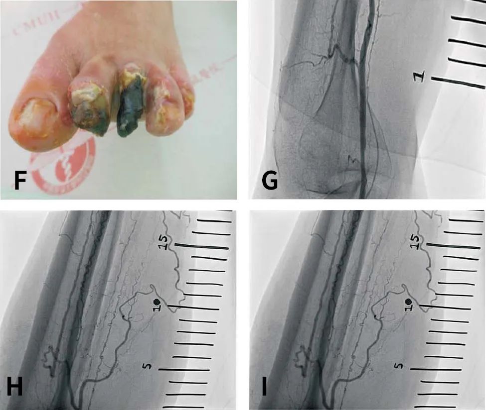 缺血的足趾出现干性坏疽改变,Rutherford分级为6级(图1F)。血管造影显示胫前动脉狭窄(图1G),胫后动脉和腓动脉慢性全闭塞(图1H),以及踝上水平的迂曲小侧支动脉和Buerger病典型的螺旋状血管改变(图1I)。