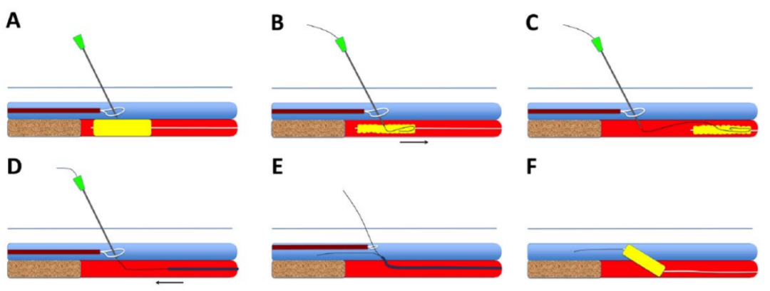 图5. 静脉动脉化简化技术 。(A)将针插入,指向动脉球囊导管。(B)针进一步推进,穿过球囊导管,最后在穿过圈套器环时穿透静脉。(C)拔出针;回撤圈套器,通过静脉鞘取回。(D)支撑导管从静脉进入动脉。(E)再放置一根0.014英寸导丝,直到它清楚地定位在静脉腔内。(F)动静脉吻合口血管成形术。