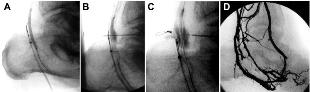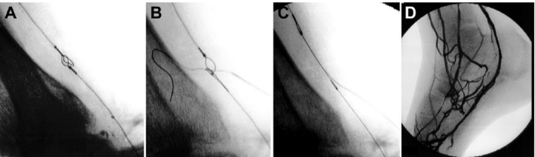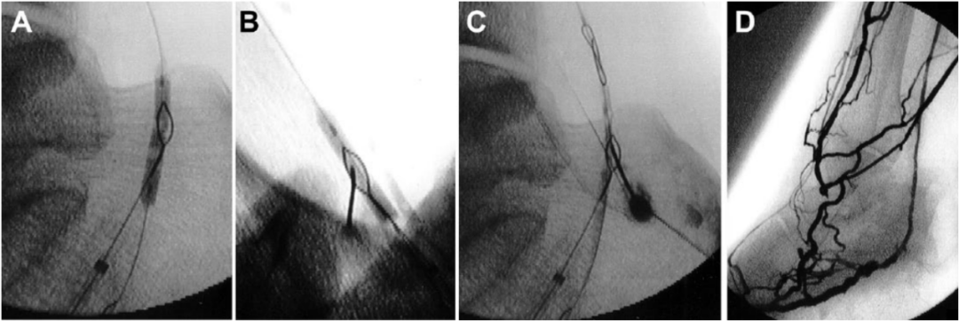 图6. 静脉动脉化简化技术术中造影(A) 静脉圈套器位于动脉球囊导管后方。(B) 22-G微穿刺针经皮推进,穿过球囊和圈套器环。(C) 推进导丝。圈套器环闭合并收回。(D) 静脉动脉化的血管造影图像。