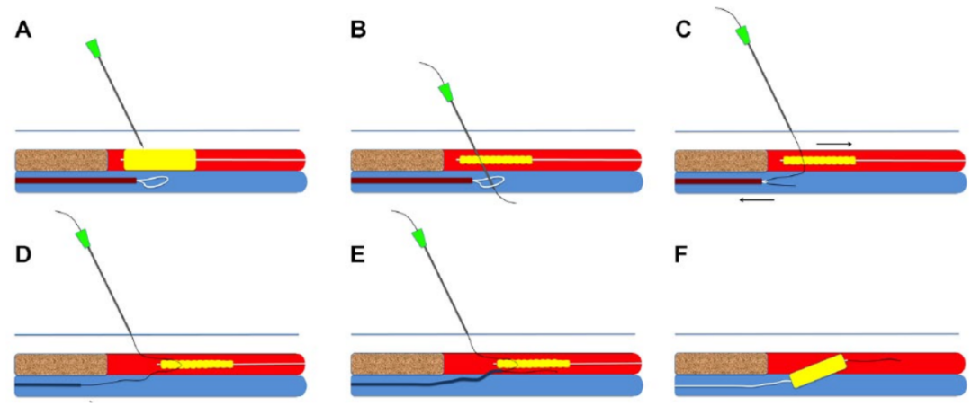 图3. 静脉动脉化简化技术示意图。(A)插入针头,穿过静脉的两层壁和圈套器环。(B)针头到达动脉并刺穿球囊导管。将一根0.018英寸的导丝推进并放置在刺穿的球囊内。(C)撤出球囊导管,保持导丝卡在球囊内,以便回撤通过股鞘将其引出体外。(D)顺行推进支撑导管。(E)推进0.014英寸的导丝,直至其明确位于静脉腔内。(F)动静脉吻合口血管成形术。
