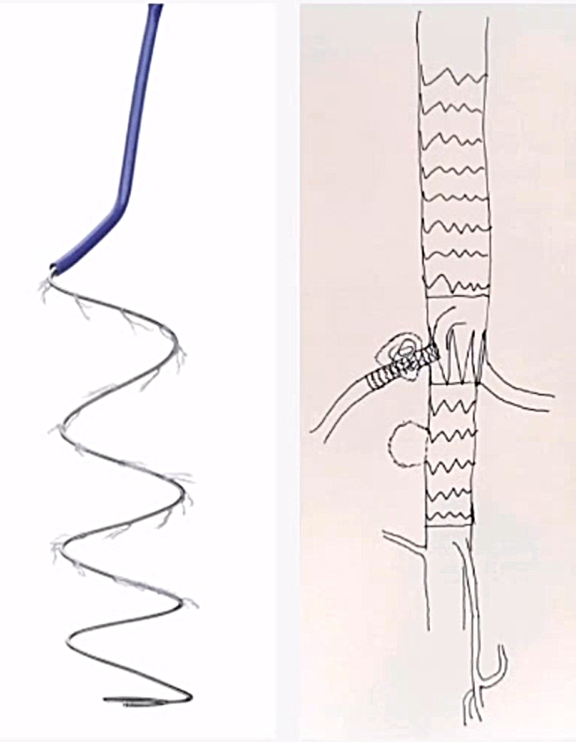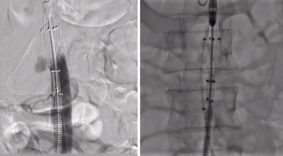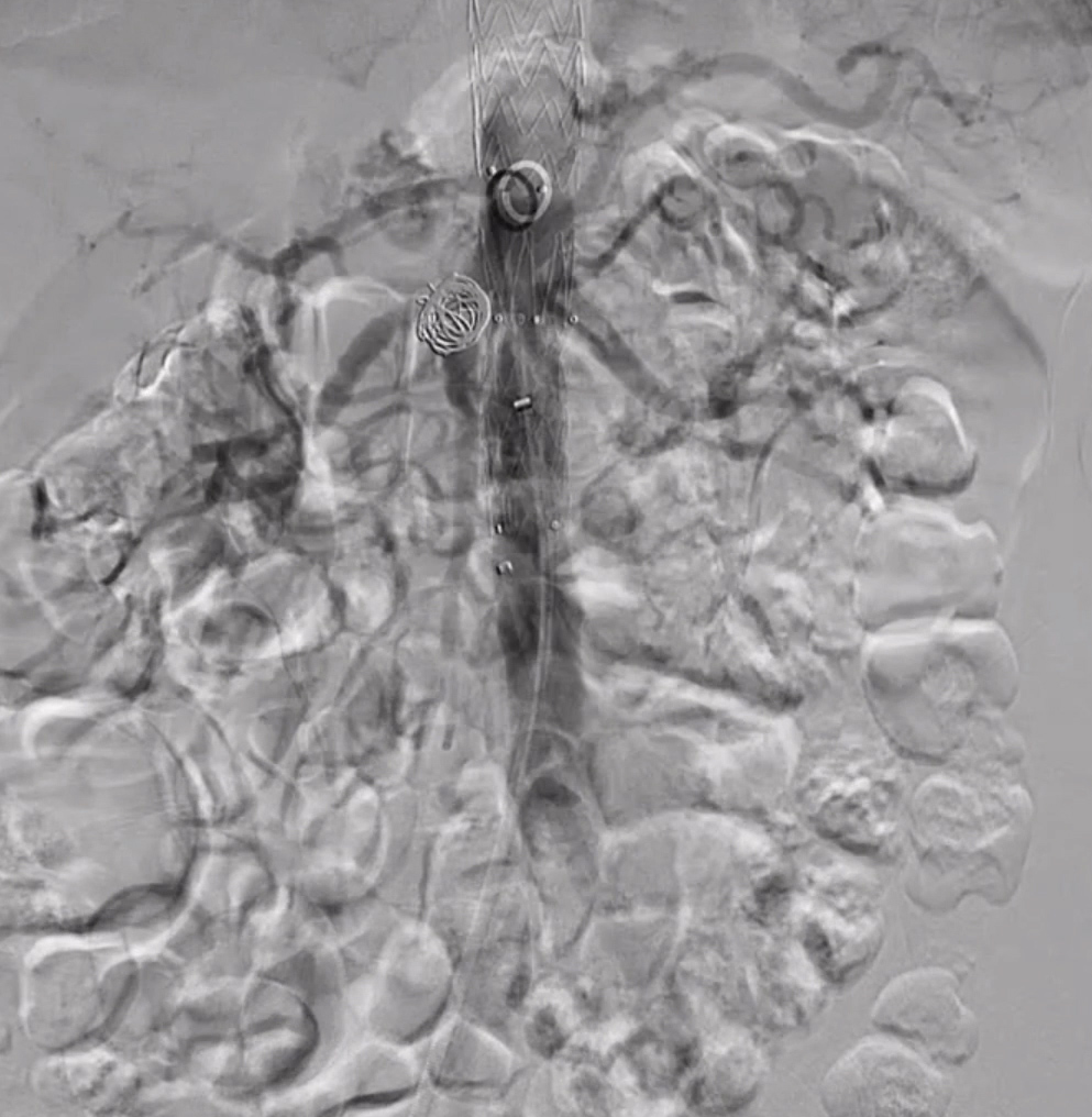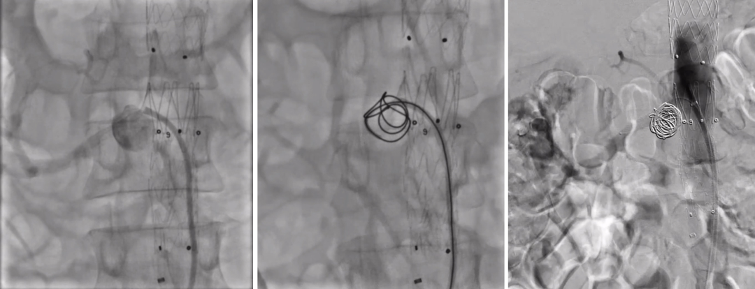 右肾动脉内植入Viabahn 7mm×25mm,超出主动脉内5mm释放