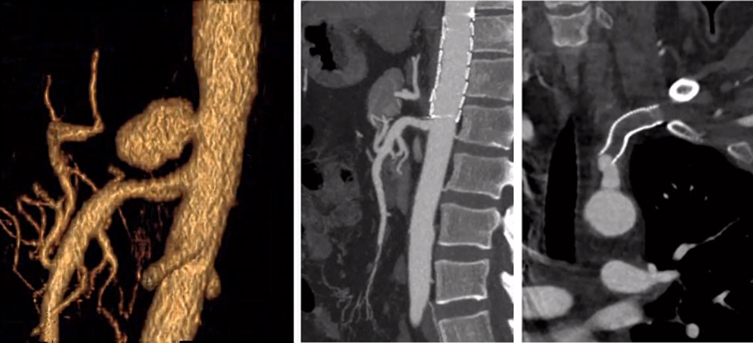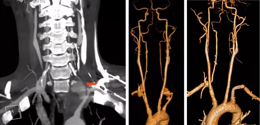 术后12个月CTA:腹腔干动脉起始部假性动脉瘤已经消失,肝总动脉和脾动脉显影良好;左锁骨下动脉支架闭塞