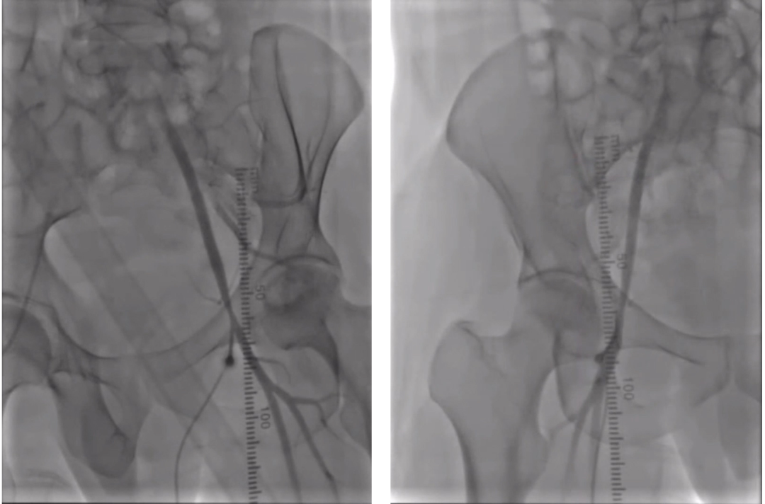 双侧股动脉入路,右侧预置Perclose Proglide(支架入路),左侧6F 55cm长鞘,造影定位;