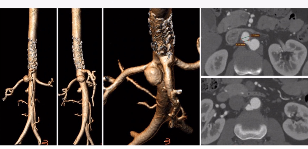 CTA:右肾动脉起始部假性动脉瘤形成(直径约1.5cm);肾下腹主动脉假性动脉瘤形成(直径约2cm)