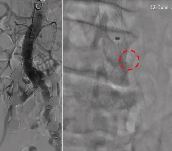 寇镭主任手术后总结戈尔VBX的使用经验,在本例手术中使用的8mmVBX其直径可后扩到8mm-16mm,没有明显短缩。利用其可变径的产品特性和对吻操作技术可使其在腹主动脉支架内呈DOUBLE-D形态打开,最大程度减少假腔,其远期通畅率值得期待。