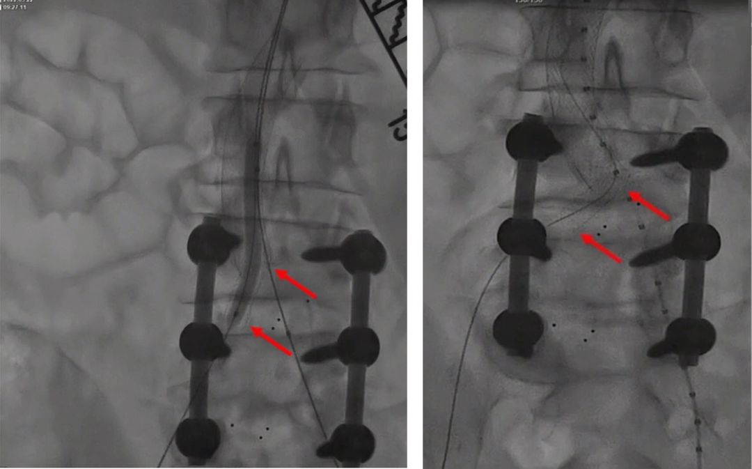 左侧导丝要经过右侧原裸支架后面进入腹主动脉,右侧导丝要确保从原有支架内全程通过,不能从网孔内通过。所以,右侧通过裸支架时,导丝成袢通过。导丝通过后,造影确认。