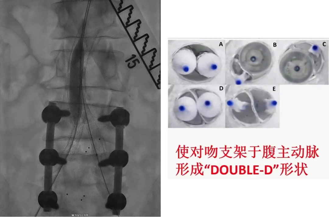 c) 双侧同时球囊扩张,最大扩张压力12atm,确保双侧球扩覆膜支架在腹主动脉段呈“Double-D”形状完全打开,最大程度减少覆膜支架与腹主动脉壁间的空隙