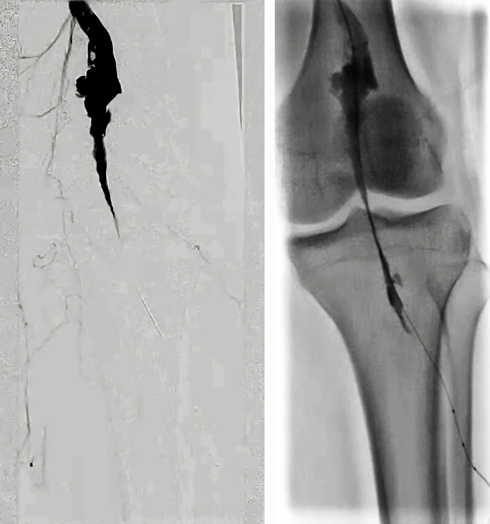 5F导管吸栓,4mm球囊扩张腘动脉。