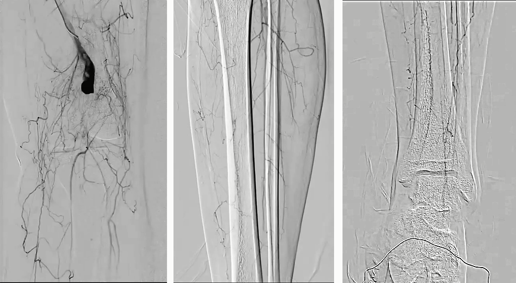 1. 右侧股动脉穿刺,翻山顺行造影显示腘动脉瘤及以远闭塞,仅胫前动脉及腓动脉的近中段显影,踝关节处小腿动脉显影不良,通过侧枝与踝下动脉沟通;