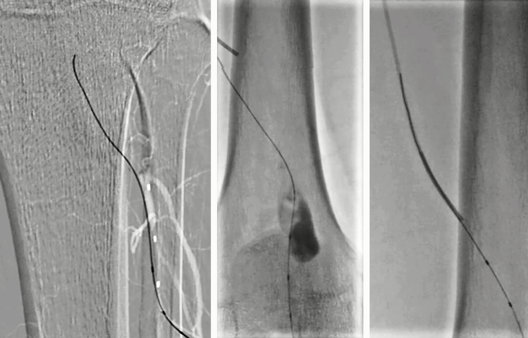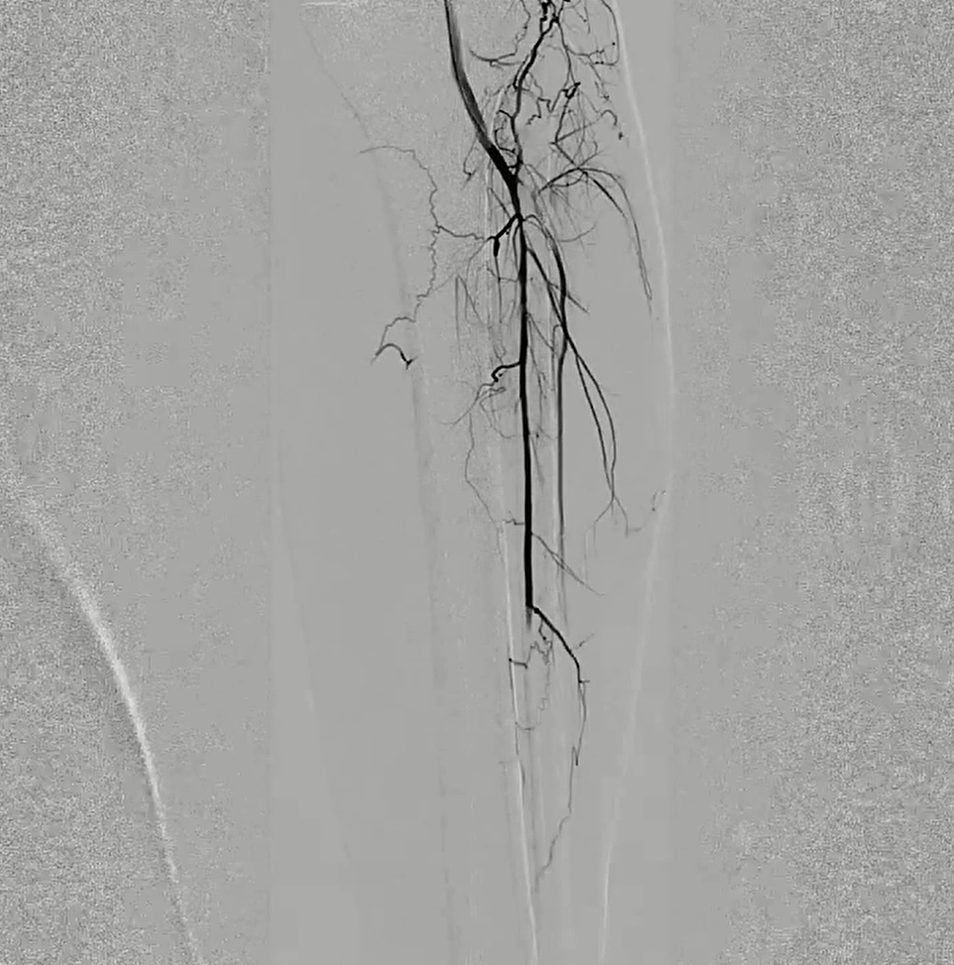 9. 入胫前动脉,3mm×60mm球囊扩张;由于脉管炎血管扩张后发生痉挛,予罂粟碱10mg后,胫前动脉和腓动脉近中段血流通畅,但仍存少量痉挛后狭窄,远端流出道通畅;