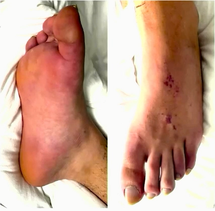 ②足背及足趾散在花斑;