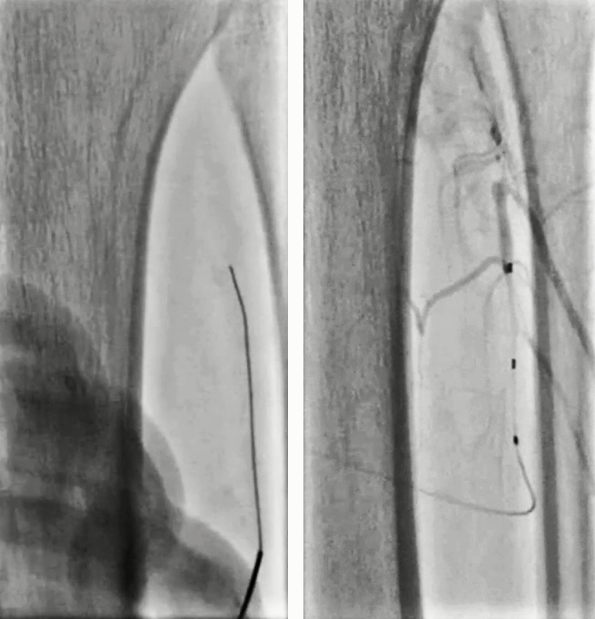 2. 由于顺行无法到达远端真腔,因此从腓动脉逆穿送入V-18导丝,经18支撑导管造影寻找真腔;