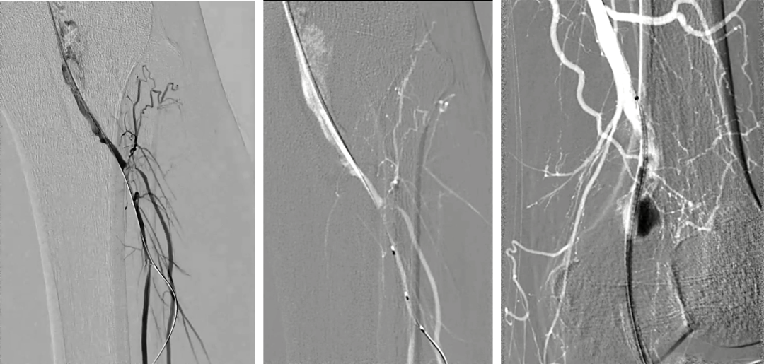 8.造影见动脉瘤消失、支架通畅、腘动脉远端狭窄和造影剂滞留;自近端将导丝置入腓动脉,3mm×60mm球囊扩张;造影见腓动脉形态良好,无造影剂滞留,见胫前动脉开口狭窄;