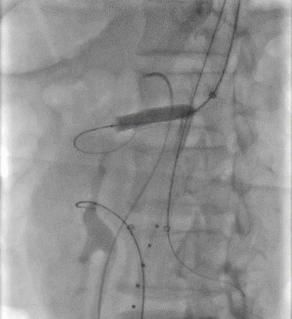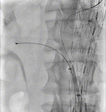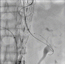 6mm球囊预扩张狭窄的腹腔干开口,并送入9*100mm 戈尔Viabahn覆膜支架