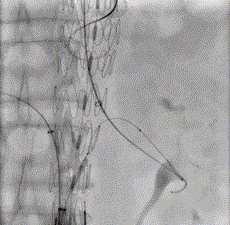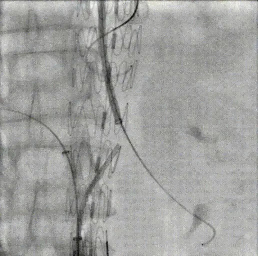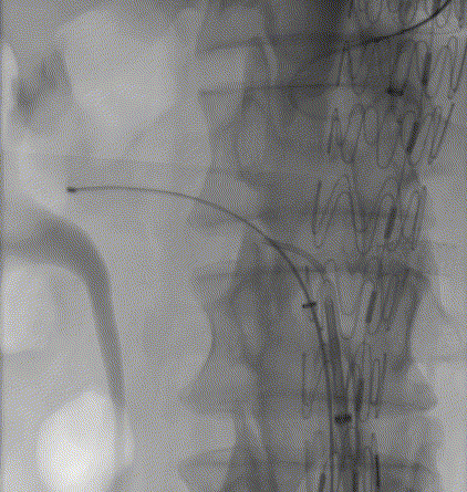 通过事先预置在假腔内的导管选入肠系膜上动脉,作为开窗的指引。Rups-100搭配Futhrough™穿刺破膜,超选进肠系膜上动脉并使用奔腾2.5mm和4mm球囊扩张穿刺点。置入12F长鞘,送入并释放11*50mm Viabahn支架。