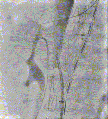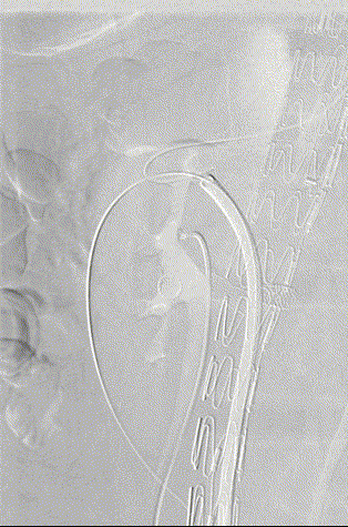 造影提示胸腹主动脉夹层封堵满意,假腔无显影,无内漏。分支动脉及髂动脉血流通畅。