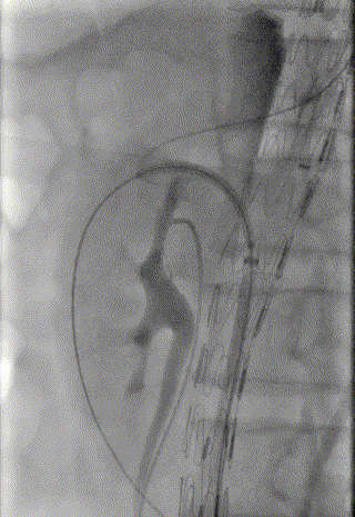 经右肾动脉内预置导丝指引,使用Rups-100和先健Futhrough™主动脉覆膜支架破膜系统穿刺假腔和主体支架,奔腾4mm球囊扩张穿刺点。MPA导管配合V18导丝在假腔中超选右肾动脉,通过球囊带鞘将长鞘跟进到右肾动脉,释放7*50mm Viabahn,6mm球囊扩张并造影。
