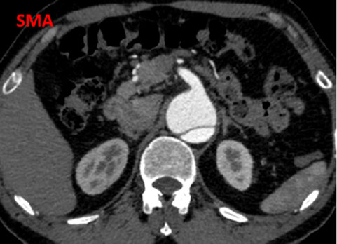 (4)肠系膜上动脉完全假腔供血,血液可通过远端裂口灌注肠系膜上动脉,避免肠缺血,未做预留导丝。