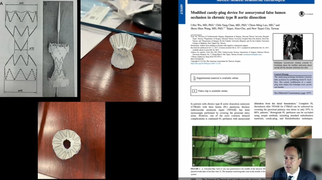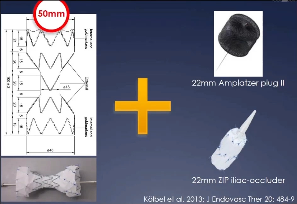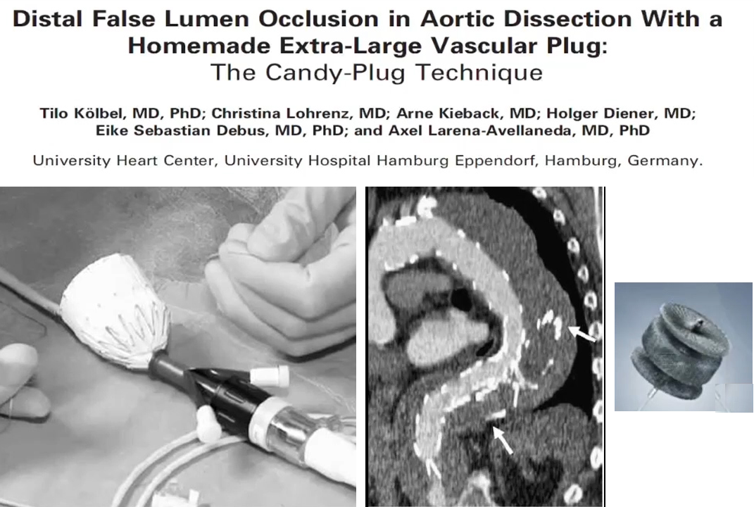 可以看到下图中有一个COOK的产品,这种产品在欧洲上市,但是在美国并没有。Candy-plug内部的尺寸比假腔的平均直径大10%~30%,在腹腔干上方1cm处与真腔内的支架平行放置,随后将假腔封堵住。