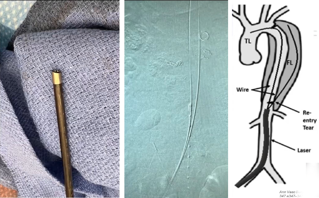 1、使用激光导管,从下方进入假腔和真腔。(通常使用的是12F导管,长度为50cm);