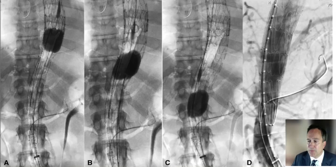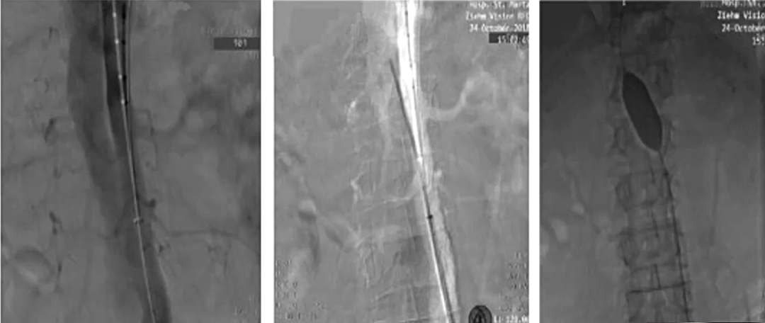 根据下图中的操作细节和结果可以得到的信息为:从出现症状到STABILIZE手术的间隔时间是9个月,可以看到使用球囊对覆膜支架下方的裸支架进行后扩张,改善贴壁并获得更好的定位。