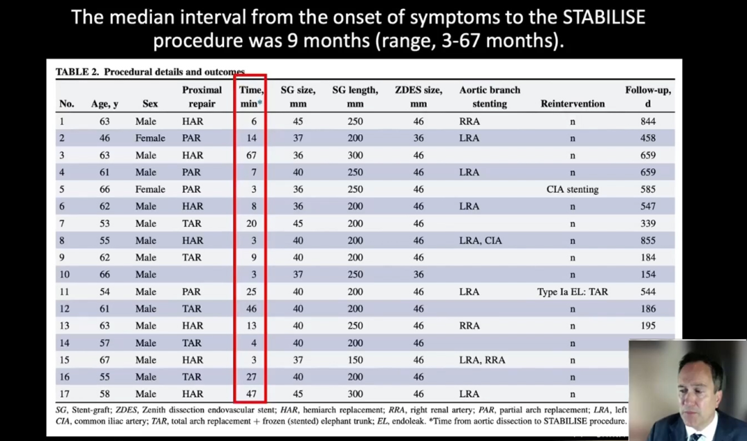 根据下图数据,可以看到STABILIZE技术一个显著的并发症,也是我们必须要注意的地方:在球囊扩张过程中(不能在大于42毫米的远端动脉瘤上进行),会出现假腔血栓远端迁移。可能是因为影响了部分附壁血栓,并使其向远端移动。