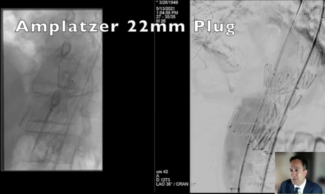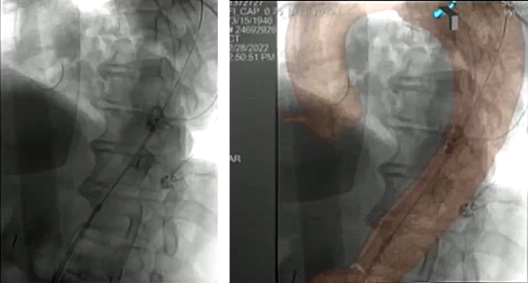 4、我们需要在置入处放置22mm血管塞,放置位置需要准确及牢固。之后对真腔进行球囊后扩张,以此确保支架能够获得良好的封闭效果。