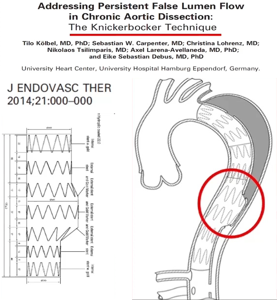 Knickerbocker技术的主要优点是在于它不需要必须进入假腔或者添加更多材料。其概念是使用顺应性球囊,对位于真腔的覆膜大支架的中间部分尽可能进行扩张,有控制地使夹层内膜片破裂,支架中部膨胀至假腔,真腔压迫假腔, 使假腔缩窄。目的是减少假腔逆向返血,促进血栓化。