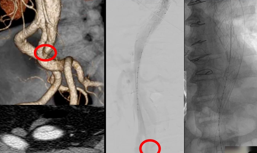 2、下图为病例的影像图,可以看到支架的位置,受到压迫的真腔位置就在此处,通过影像图可以看到这里出现了内漏,必须进行处理;