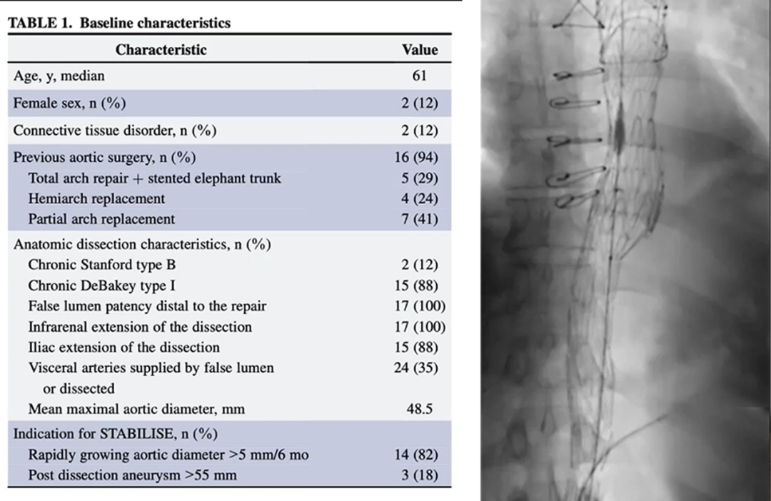 在3个月内对慢性夹层患者进行随访,对首批17名患者的早期经验和17个月的随访,其结果证明了应用此技术早期的安全性,具体表现为:无死亡率、无主动脉破裂以及很少有并发症出现。