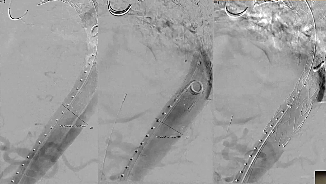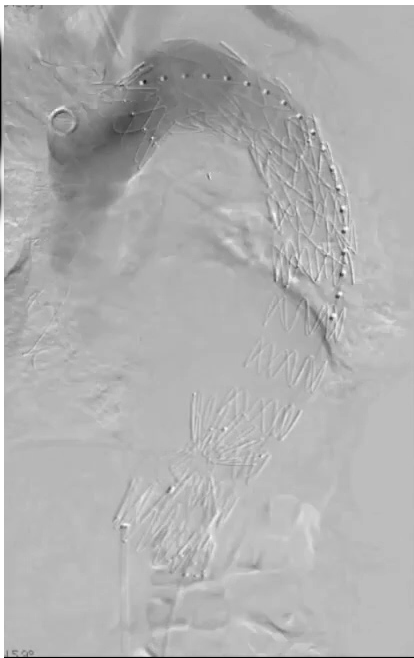 3、通过下图可以看到它恢复了主动脉的正常口径,内膜片已消失,支架基本上已经打开到主动脉的真实直径,实现了远端密封。