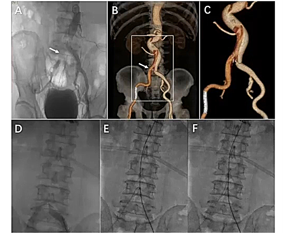 举一个在髂总动脉继发破口处进入假腔的一个例子: