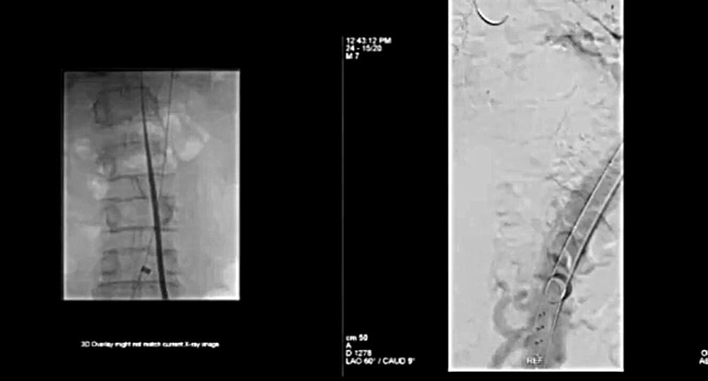 2、将导丝装入导管,如下图所示推进导丝,血管造影图上可以看到导管正在向上移动。随后使用激光在行进过程中将内膜片烧毁;
