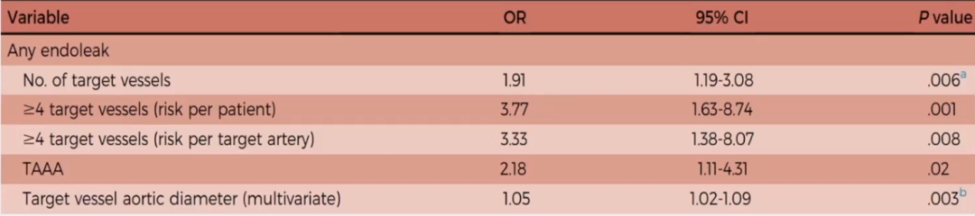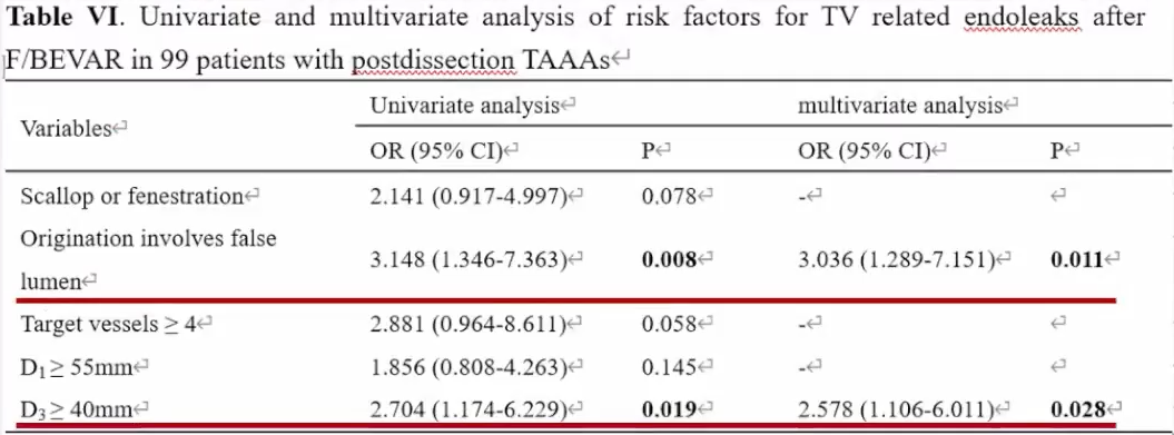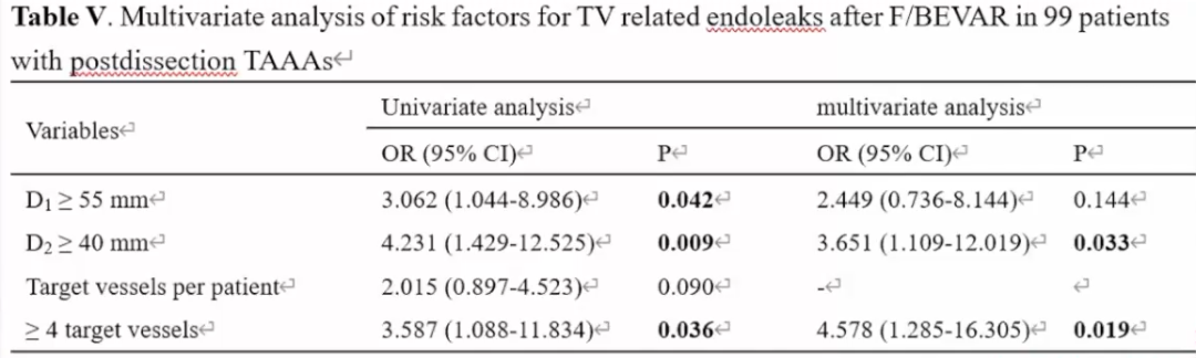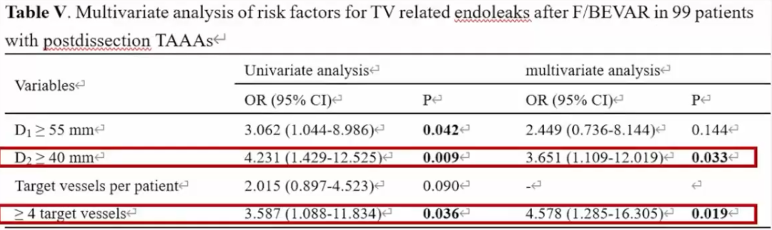► 经过单因素和多因素分析,发现该样本内脏区主动脉的最大直径大于等于40mm,以及重建的分支数量大于等于4个,成为了促进F/BEVAR术后分支相关内漏的独立危险因素。