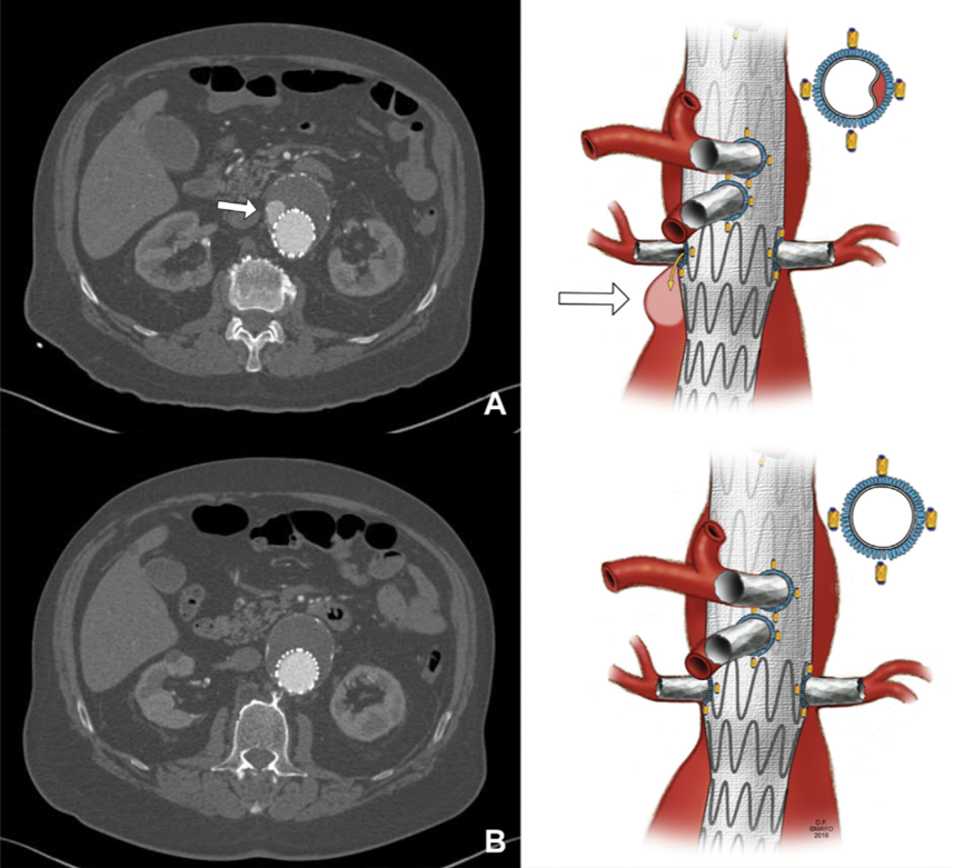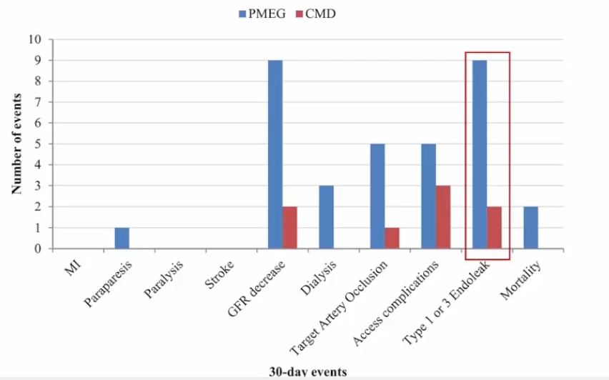 有研究报道术中改良的开窗与分支支架(PMEG)的术后30天并发症明显高于厂家定制的开窗支架(CMD),尤其是在I型或III型内漏方面。