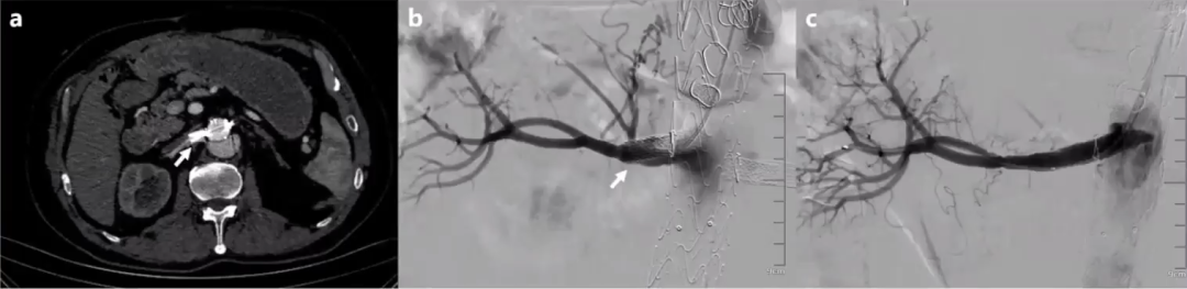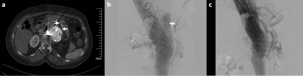 患者女,68岁,3年前因腹主动脉瘤于我院行EVAR+肠系膜上动脉、双肾动脉支架植入,术后半年因内漏行瘤腔弹簧圈填塞。2022年初再次触及腹部搏动性包块,入院后检查提示肠系膜上动脉支架脱出,导致IlIc型内漏 (a,b)。在原支架内置入一覆膜支架后消除内漏(c)。