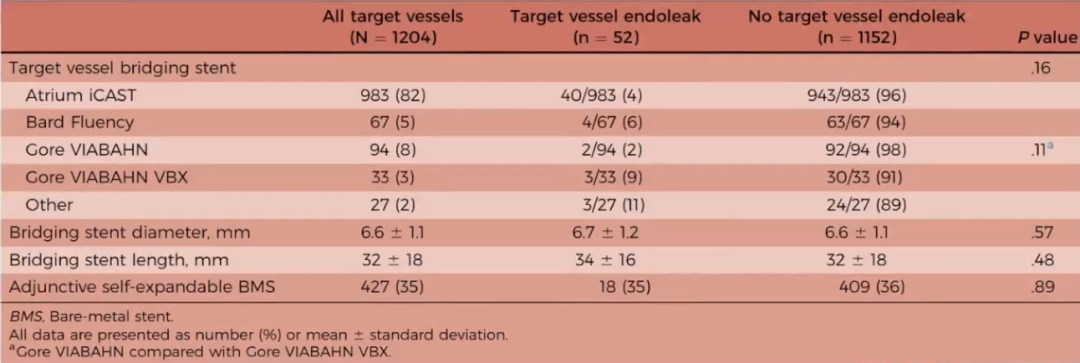 所用分支支架品牌之间也未见明显差别,但Viabahn术后分支相关内漏似乎少于Fluency。