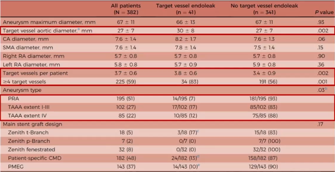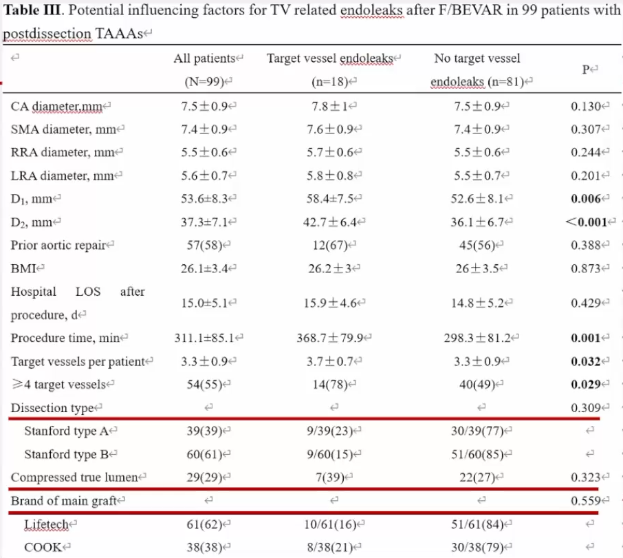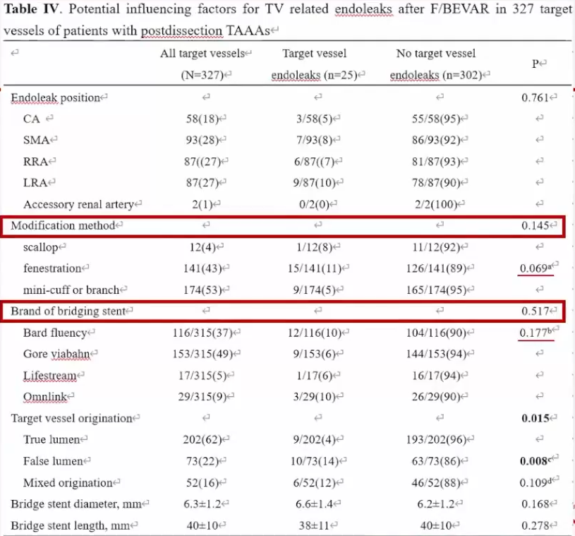► 除此以外,本研究还探讨了夹层的类型,真腔受压以及主体支架的品牌对分支相关内漏的影响,但未发现阳性结果。